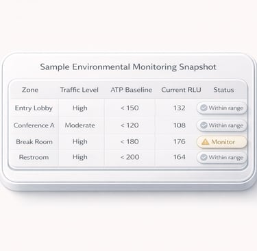 Baseline ATP readings are established per facility and calibrated by zone, reflecting environmental context rather than generic universal thresholds.