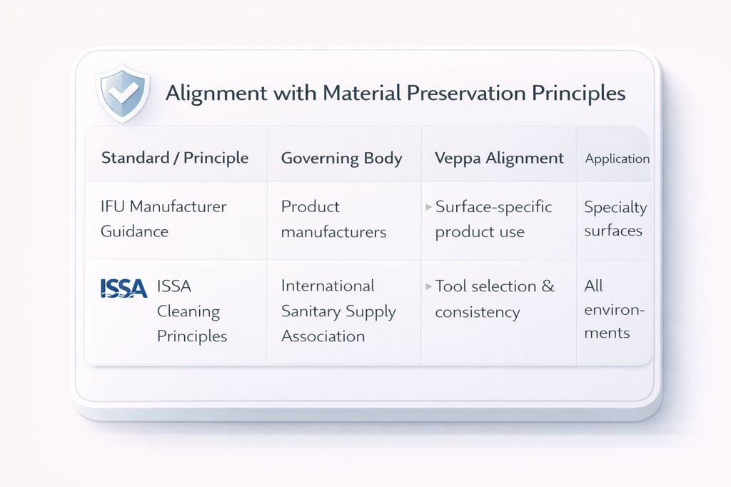 Veppa Services applies these frameworks to inform environmental hygiene systems — not to claim certification or regulatory authority. These standards guide risk stratification, documentation structure, disinfectant selection, and staff safety protocols within the scope of environmental care and surface preservation.