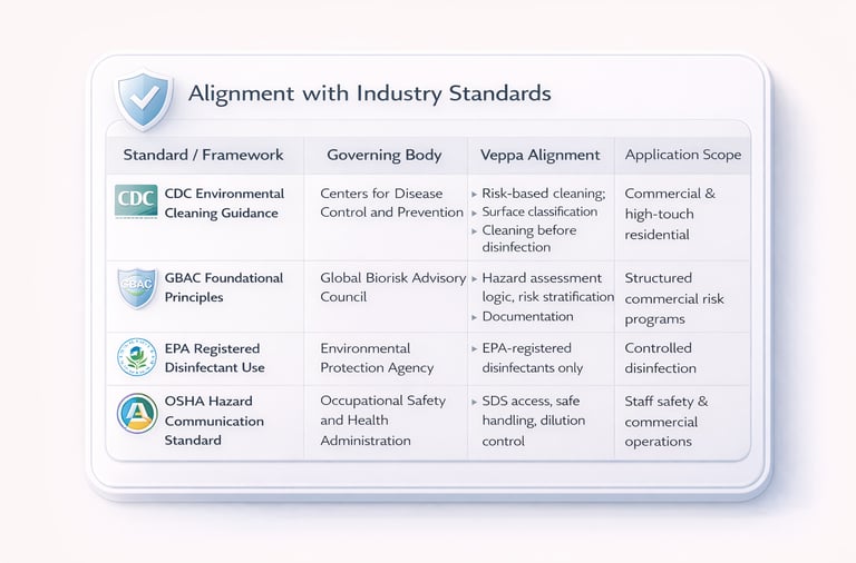Veppa Services applies recognized public health and industry standards to guide our environmental care methodology. The table below summarizes key frameworks that inform our risk-based, material-aware cleaning and hygiene practices.